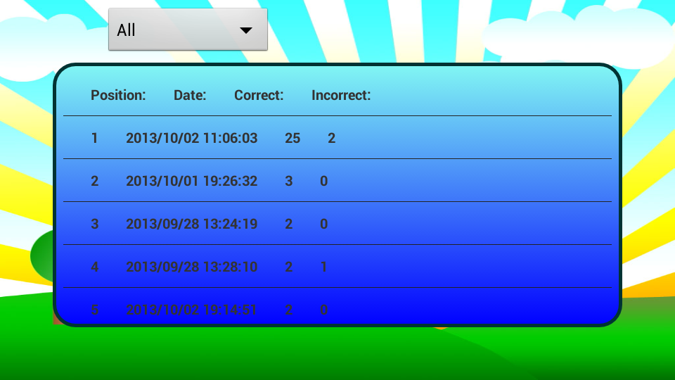 También se dispone de una lista de ranking para saber las puntuaciones que vas logrando. Además, los resultados se podrán filtrar y ver sólo las puntuaciones del filtro seleccionado. Ej: Las 10 mejores, las 10 peores ...