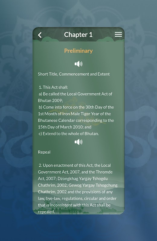 -All the chapters and contents of the Local Government Acts of Bhutan can be accessed alternatively through the audio format. The audio format provides voice narration of all contents. Users can switch swiftly between the conventional “read” format and “audio” format as per their preference.