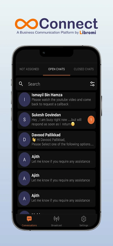 Libere todo el potencial de su comunicación comercial con la aplicación User Agent de Libromi.com. Connect es una plataforma poderosa que habilita la solución de chat de agente multiusuario, impulsada por la API oficial de WhatsApp Cloud. Registre su empresa como negocio en Libromi.com y cree una cuenta de agente de usuario para comenzar a usar esta aplicación revolucionaria. Agilice sus conversaciones, aumente la productividad y lleve el compromiso del cliente a nuevas alturas. ¡Descárgalo ahora y revoluciona la comunicación de tu empresa!