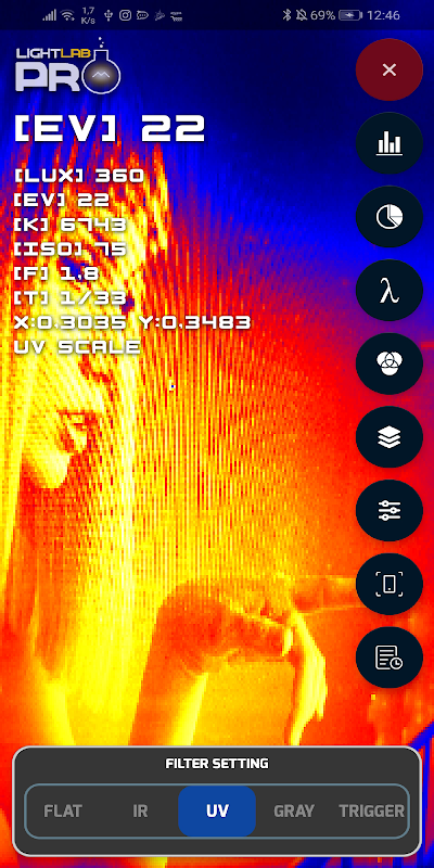 Además de los parámetros de exposición, LightLab PRO mide el espectro de color de los sargentos que proporcionan el valor del punto blanco y el valor de la temperatura del color en Kelvin.