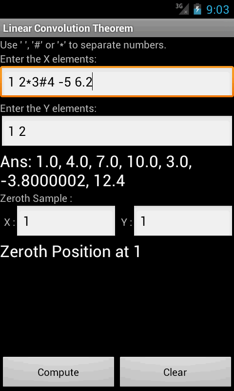 This is an app for those who use the linear convolution theorem. It will directly give you the result of the problem as you enter your X and Y values.