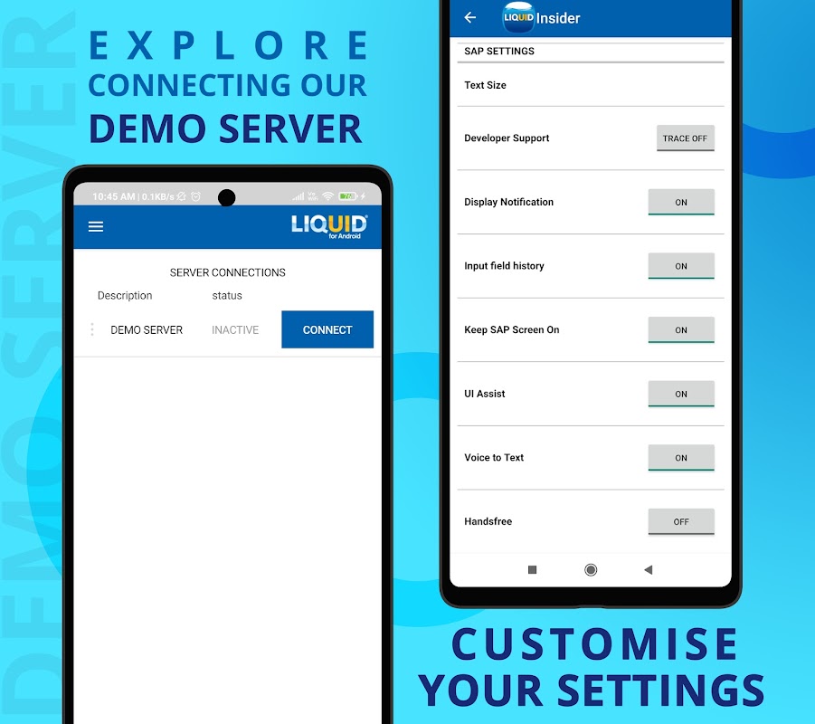 Además, con Liquid UI también puede innovar FLEXIBLEMENTE sus transacciones SAP en Android según los requisitos de su negocio junto con sus necesidades de bienes raíces de pantalla. Además, disfrute de la misma SEGURIDAD que obtiene con SAP debido a la conectividad nativa de la aplicación y la compatibilidad con el cifrado TLS sobre los datos transmitidos de forma inalámbrica.