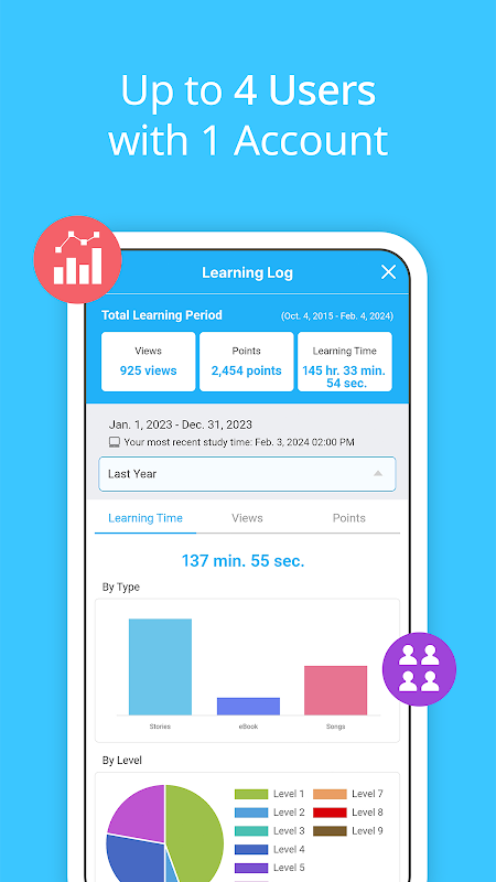 - ¡Agregue hasta tres niños! Una cuenta es para hasta cuatro usuarios, con datos de aprendizaje individuales. (Solo un usuario puede iniciar sesión a la vez). Los usuarios principales pueden monitorear el progreso de aprendizaje de los usuarios secundarios.