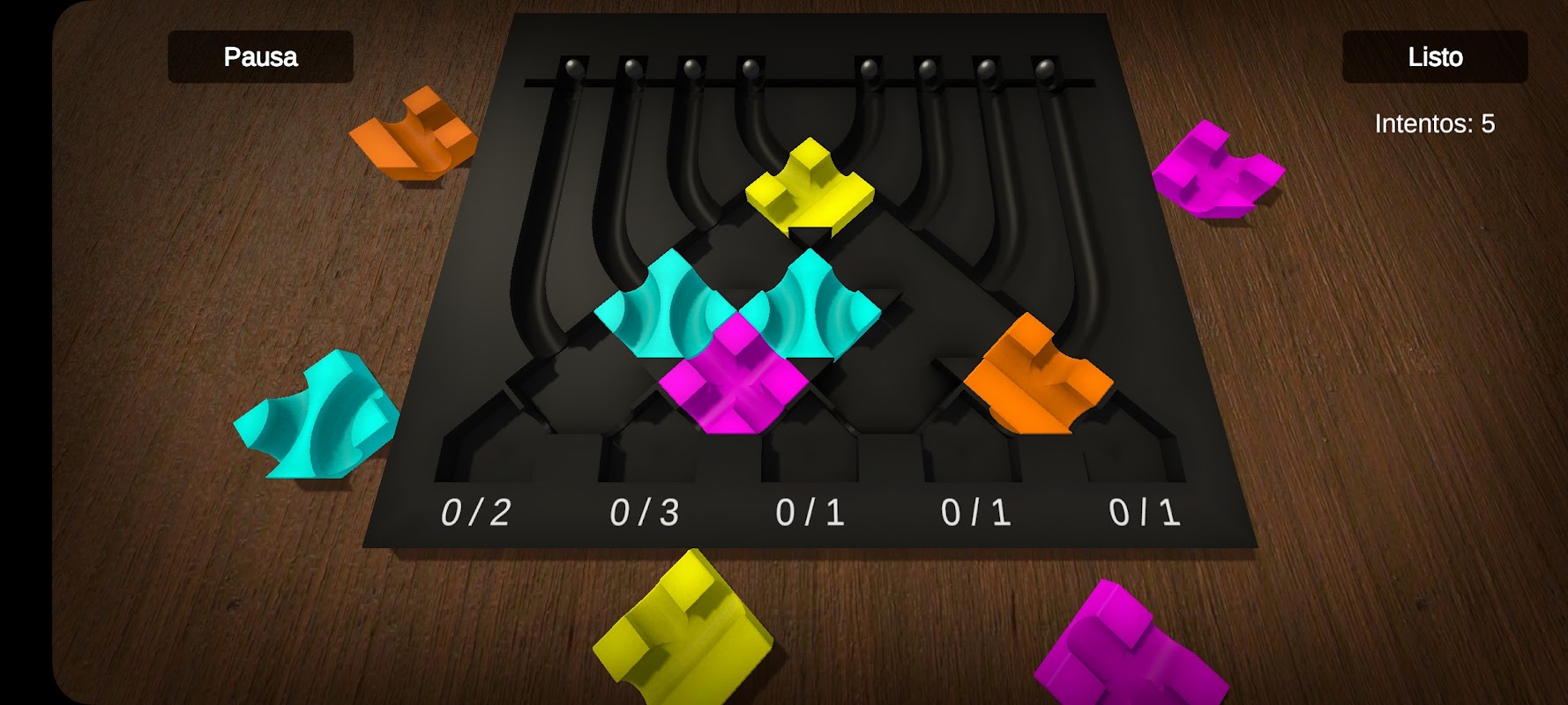 El objetivo del juego es hacer que las pelotas de metal caigan en la bandeja de abajo, en cada bandeja debe de entrar cierta cantidad de pelotas, puedes definir el camino de las pelotas en base a las piezas que coloques en el tablero.