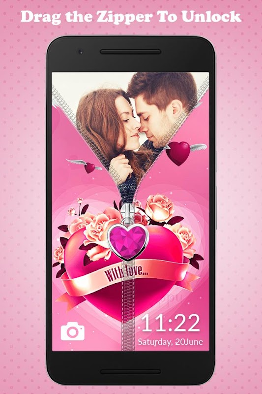 Zipper lock screen with sweet animated hearts! Love lock screen is a fun and free application for entertainment purposes. You can use the application to lock your phone screen. Slider lock screen is very easy to use. All you have to: drag the slider down and the phone screen is unlocked. Inside of the application you will find beautiful backgrounds with animated hearts.