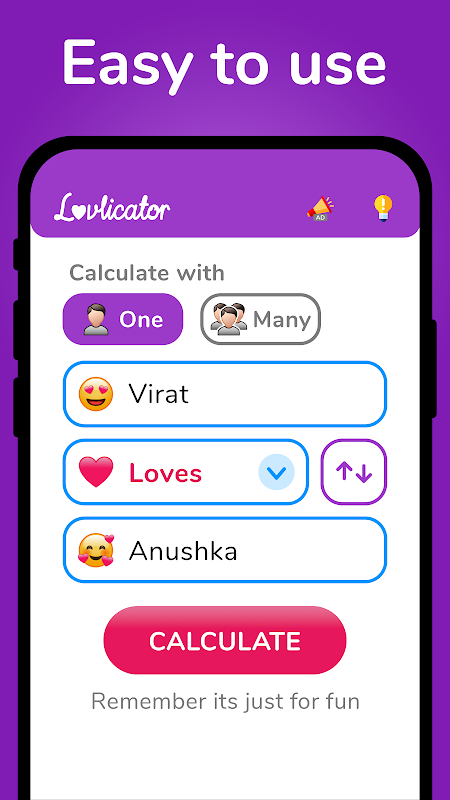Entra en la pestaña 'Muchos' y prepárate para sorprenderte, donde podrás dar rienda suelta a tu curiosidad y calcular los resultados para toda una lista de nombres. Elija entre una amplia gama de categorías, como actores, lugares, colores y más. ¡Es como una montaña rusa salvaje de cálculos de amor! Y deja que el mundo sepa cuánto amas a tu jugador de críquet o actriz favorita. 🤩