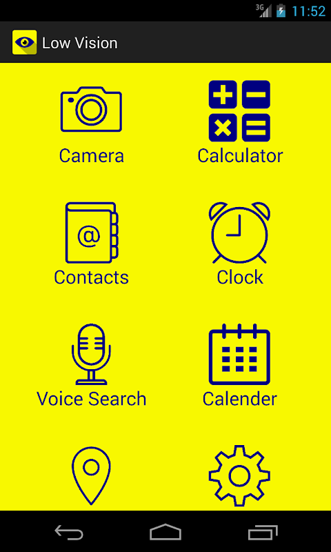 Multi-featured application for people having Low Vision! This app has the option to view enlarged Contacts, Camera, Calculator, Clock and Current Location features with bold and low vision friendly color themes to easily access contents from the phone.