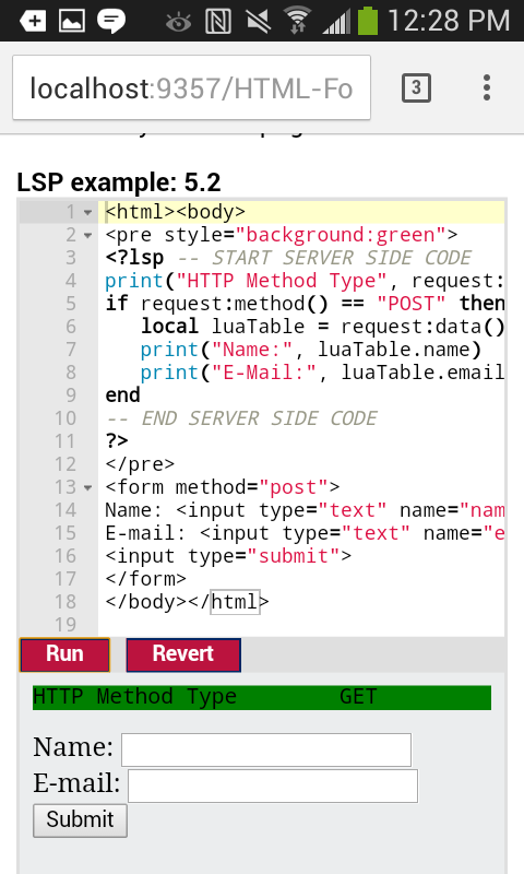 The android application includes a native web application server, with functional start/stop control and is pre-configured to download and run multiple Lua tutorials.