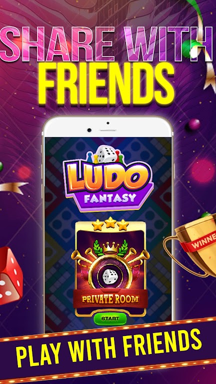 Ludo Fantasy te permite jugar en modo privado para jugar con amigos y familiares y también te da recompensas cuando compartes lo mismo con tus amigos o familiares.
