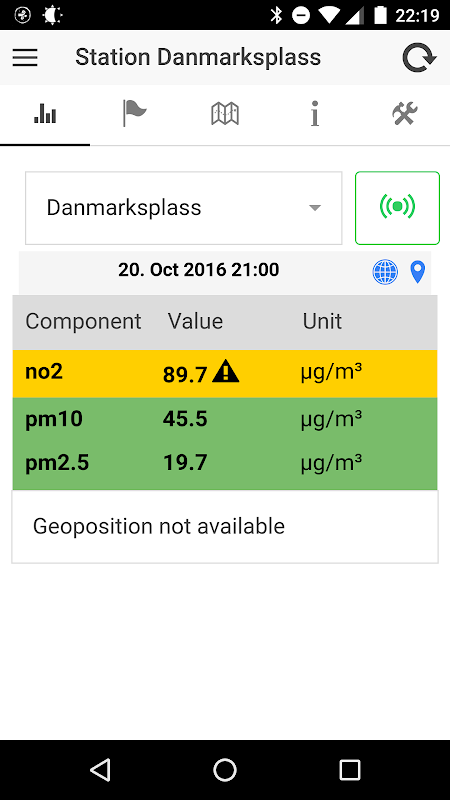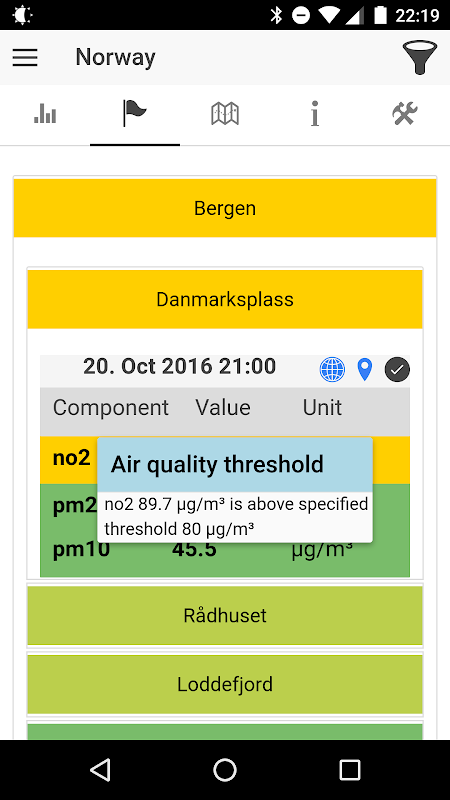 Display, monitor and track air quality / pollution measurements from measurements stations from luftkvalitet.info in Norway.