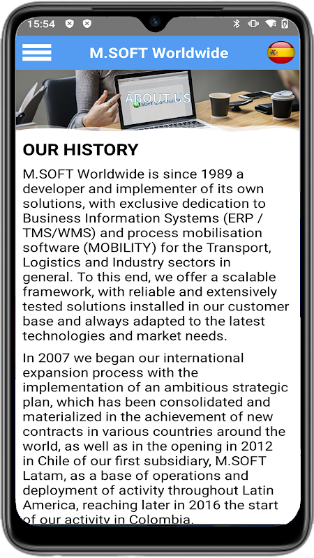 M.SOFT Worldwide es desde 1989 un desarrollador e implantador de sus propias soluciones, con dedicación exclusiva a los Sistemas de Información de negocio (ERP /TMS/WMS) y software de movilización de procesos (MOBILITY) para el sector del Transporte, la Logística y toda la Industria en general. Para ello ofrecemos un marco escalable, con soluciones fiables y ampliamente probadas e instaladas en nuestro parque de clientes y siempre adaptadas a las últimas tecnologías y necesidades del Mercado.