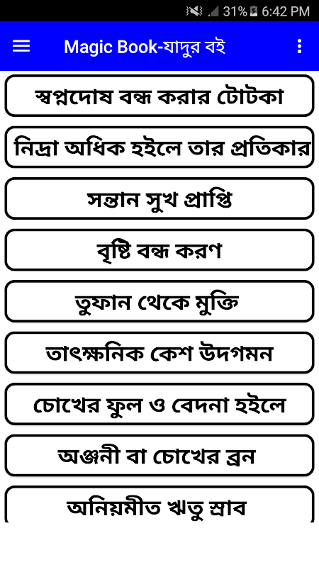 এই Apps এ আছে সকল প্রকার যাদু মন্ত্র।মেয়ে পটানোর যাদু সহ আরো অনেক রকম মন্ত্র এখানে পাবেন। যদি আমাদের এই এপসটি ভালো লাগে তাহলে অবসসই আমাদের Rate দিতে ভুলবেন না..!