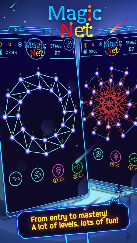 Magic Net es un interesante juego de rompecabezas de descifrado. Los jugadores deben desentrañar la compleja red mágica entrelazada, formando una línea que no se cruce. El juego cuenta con cientos de estilos diferentes de redes cruzadas, diseñados para que el jugador los desbloquee paso a paso. De hecho, completar la Magic Net rápidamente no es difícil. Siguiendo el principio de la línea más corta entre dos puntos, la compleja conexión se descompondrá en triángulos para lograr fácilmente que todos los segmentos de línea no se intersequen. Este juego ofrece cientos de niveles para desafiar, desde lo más simple hasta lo más complejo, paso a paso para desafiar la imaginación del espacio. Al desentrañar las complejas líneas y convertirlas en hermosos gráficos, experimentarás una sensación de logro inigualable. ¡Disfruta rápidamente del juego con tus amigos!
