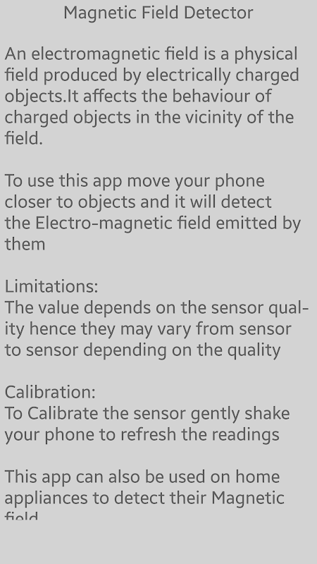 El detector de campo magnético es la mejor aplicación para detectar el campo magnético a tu alrededor. La aplicación está diseñada para fines de estudio para estudiantes de electricidad. tiene la capacidad de medir con precisión el campo magnético de diferentes dispositivos electrónicos que también con la ayuda de su teléfono inteligente detector de campo magnético.