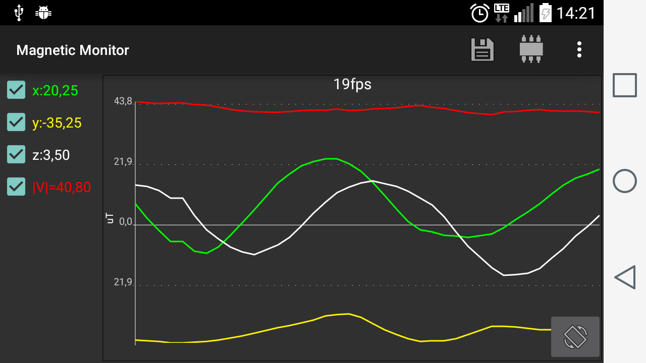 Muestra los valores de los campos magnéticos en el gráfico.Almacena los valores en la tarjeta SD.