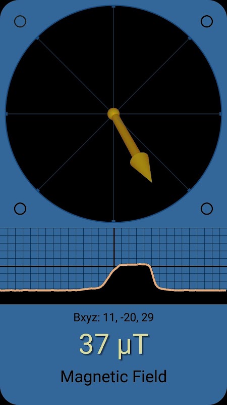 Se trata de un detector de campo magnético preciso, que presenta un indicador tridimensional que muestra la dirección real del campo; también muestra un gráfico simple del campo magnético (su magnitud total) versus el tiempo (un intervalo de 20 segundos a 10 muestras por segundo). Nuestra aplicación (orientación vertical, Android 6 o posterior) solo funcionará en tabletas y teléfonos inteligentes que tengan un sensor magnético. Puedes utilizar el magnetómetro para medir y estudiar el campo magnético producido por diferentes fuentes (para verificar su proporcionalidad con la distancia, por ejemplo), como detector de imanes y metales y como indicador del campo geomagnético de la Tierra.