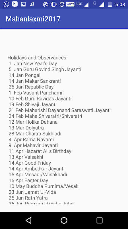 This application shows the calendar of 2017.In which you can also see the total number of holidays in year. Monthwise holiday is represented by Red color.