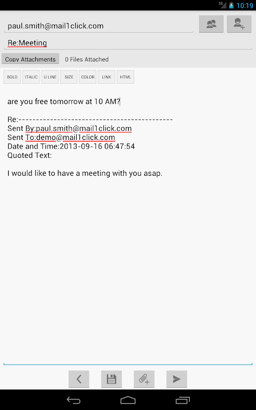 Puede enviar un mensaje cifrado a cualquier dirección de correo electrónico normal, puede recibir correo electrónico cifrado de cualquier usuario de Mail1Click y usted puede recibir correo electrónico desde cualquier dirección de correo electrónico normal. Todos los mensajes de correo electrónico con archivos adjuntos se almacenan totalmente encriptada por AES 256.