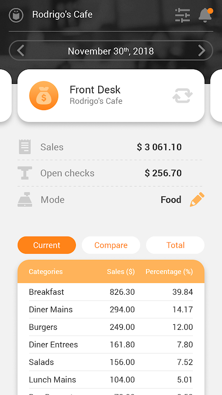 • Dashboard muestra los indicadores clave de rendimiento de hoy (KPI) como las ventas, los costes laborales, los descuentos, los recuentos de los clientes y los vacíos, con capacidad de drill-down