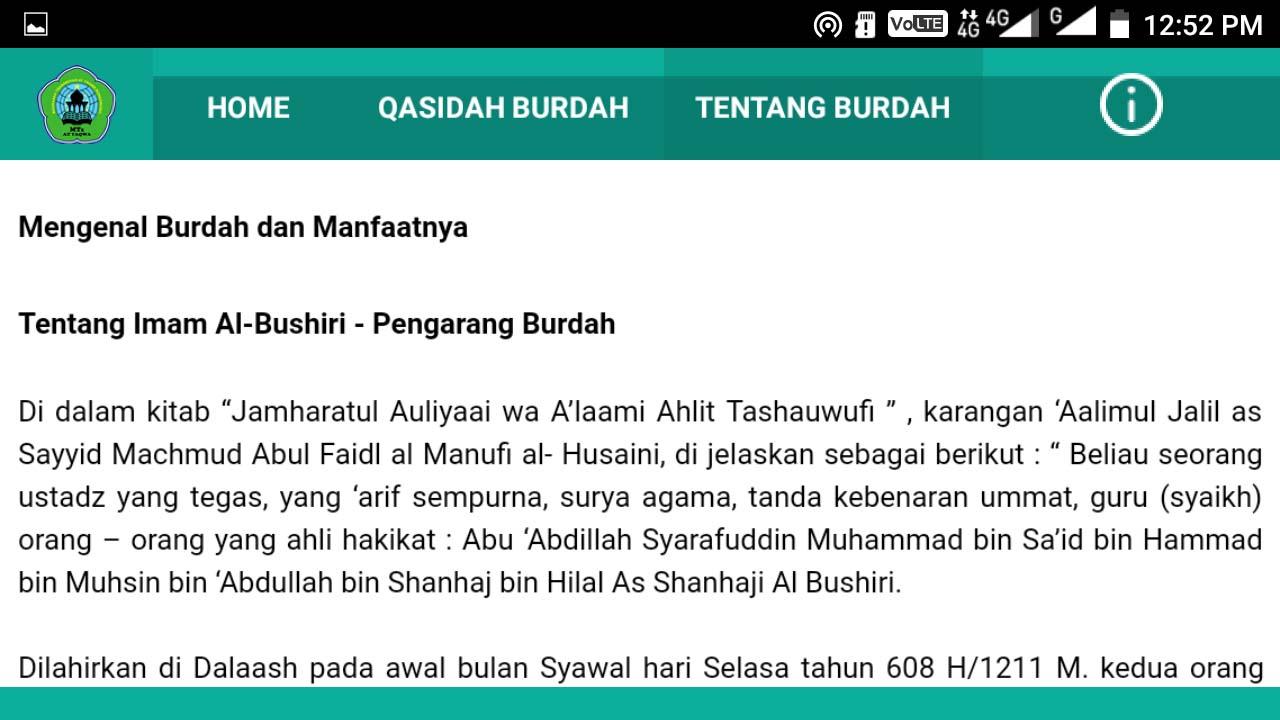 Esta aplicación fue creada para apoyar las actividades ya iniciadas desde octubre 13 año 2012 se llevó a cabo rutinariamente cada mes que todas las noches Munday legi. Seguido por estudiantes, profesores y padres, así como el público. actividad de lectura burdah qasidah está destinado a fomentar el amor por Rasulullah SAW. como una figura ejemplar en la vida.