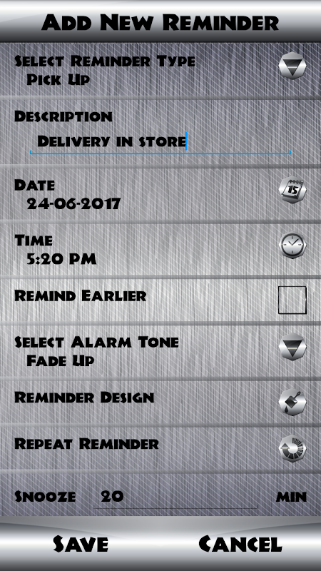 ♣♣♣ ¡Tenemos algo que va a emocionar a todos ustedes! Descargue la última aplicación de ☀Make A Reminder☀ y obtendrá ayuda para organizar las tareas más importantes. Usted probablemente está cansado de memorizar todas sus tareas diarias y tratando de recordar qué más queda por hacer. No te preocupes, has venido al lugar correcto. Con sólo un toque en su teléfono inteligente, obtendrá la herramienta más cool que va a hacer su vida mucho más fácil. Si tiene algún viaje de negocios importante que no puede faltar y quiere asegurarse de que está a tiempo, simplemente seleccione este tipo de recordatorio de la lista de tipo de recordatorio. También depende de usted fijar la hora y la fecha para ello, y si desea ser recordado antes de este importante evento en su vida, esto es posible también.