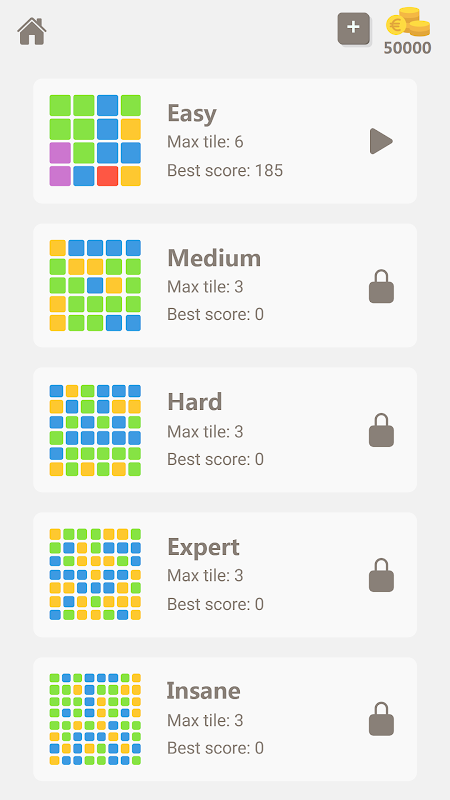 Disponemos de cinco tamaños de tablero diferentes. Desbloquea los siguientes tableros formando un 10 en los tableros anteriores o desbloquéalos con monedas.