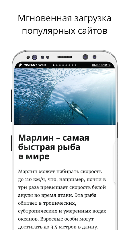Браузер Марлин мгновенно открывает новости и статьи на многих сайтах. За счет нашей технологии очистки страниц, пользователи почти не тратят время на ожидание загрузки, и серьезно экономят своё время и трафик.