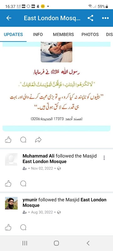 Los miembros de Masjid reciben actualizaciones de Masjid y de los miembros de Masjid (Namazi) o de la comunidad de Masjid. Comparta sus pensamientos y estado con su comunidad masjid como miembro de Masjid. Estar conectado todo el tiempo con la casa de Allah y la gente que visita cinco veces para las cinco oraciones. Tu mezquita y tu comunidad rezando en la mezquita siempre están conectadas contigo y en tus manos. Responda las publicaciones de sus compañeros Namazis y ayúdense unos a otros con el objetivo de "Compartir es Cuidar".
