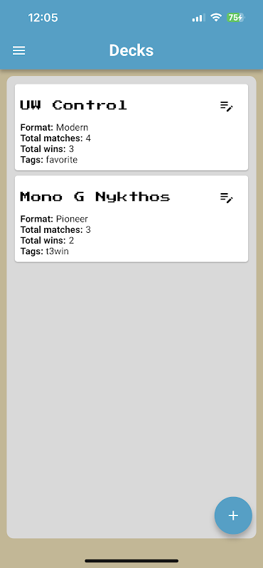 Esta aplicación está diseñada para ti que disfrutas jugando en tu tienda de juegos local y cada semana escuchas a tu amigo decir "No pierdo un solo juego para ti desde 2020". Con esta aplicación, podrás realizar un seguimiento de tus partidos, registrando tus resultados para cada uno de tus mazos. ¡Registra tus mazos favoritos, realiza un seguimiento de tus resultados contra diferentes oponentes y arquetipos, y usa los datos a tu favor para convertirte en un mejor jugador de magia!