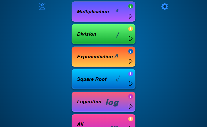 Resuelve emocionantes ecuaciones con números faltantes, elige la respuesta correcta entre cuatro opciones y ¡gana puntos! El juego cuenta con 8 niveles, cada uno centrado en una operación matemática única: suma, resta, multiplicación, división, exponenciación, raíz cuadrada, logaritmo y una combinación aleatoria de todas las operaciones.
