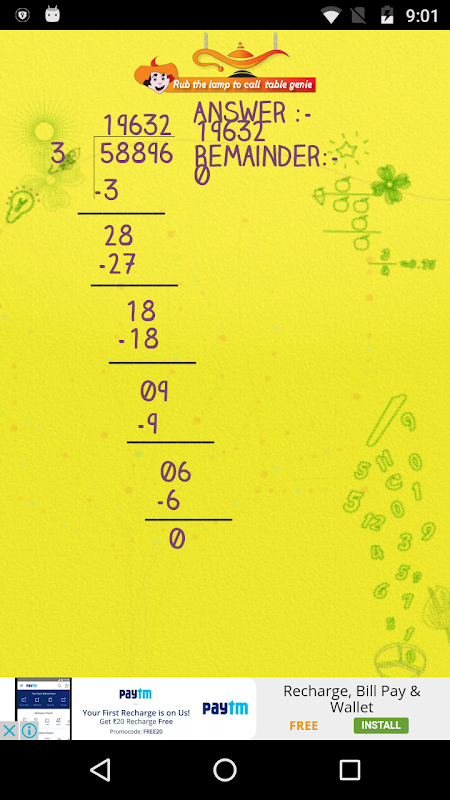 While the math calculations can be as large and complex as possible (multiplication / division), the math learning part of the app is fun and elaborates on the use of the underlying math tables and processes – so that with each calculation, your kid is learning the most native way of math calculating. If the app user is at a loss for further direction, he / she can rub the magic lamp of the genie – The math genie gives you mathematical hints to make your calculations – it also recommends the math tables required for the mathematical multiplication or division (for numbers of any size). The basic principles of math calculations are intuitively offered within this math learning app – while keeping the fun-factor alive.