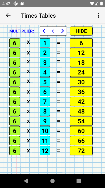 arg1 ® arg2 = [? ] Pulsando [? ] revela la respuesta. No se necesitan múltiples opciones ni el teclado del teléfono para las entradas. Solo matemática mental. Dado que las preguntas se generan aleatoriamente, cada sesión de práctica es única.