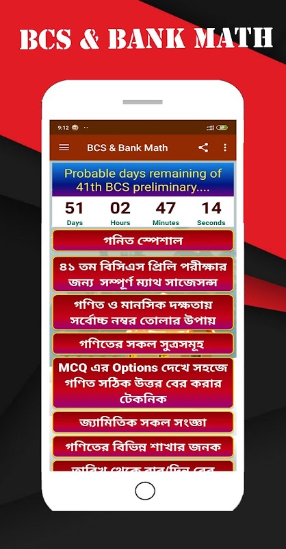 BCS Math Preparation - বিসিএস ও ব্যাংক গণিত is a math problem solver app for all level of student and job candidates in Bangladesh. This math helper app include all needed things for students and job candidates. Upcoming BCS and bank exam preparation is very much necessary.... so to math quick and short time you need to do it in quick time. So this BCS Math Preparation allow and help you to learn shortcut math to keep math basic of math. In 41 তম বিসিএস math can play a vital role to pass preliminary exam that's why added several part for upcoming BCS with giving proper explanation of every math mcq.
