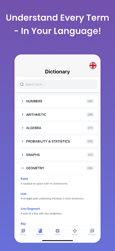 Esta app te ayuda a comprender y practicar conceptos matemáticos clave en inglés, a la vez que te ofrece apoyo en tu lengua materna. Con cuestionarios, un diccionario multilingüe, juegos y vídeos, estudiantes y profesores pueden explorar con confianza temas como álgebra, aritmética, geometría y más, en 6 idiomas europeos.