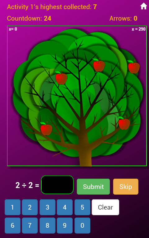 A division game activity is also included in this app. It will help develop skills in division using an apple shooting theme. Collect as many arrows as you can within 20 seconds by answering the division problems correctly. Shoot apples with arrows you collected by providing the approximate x-position of the apple on a given scale.