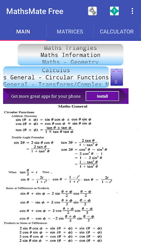 Información MathsMate Plus solucionadores libre ofrece hojas de información matemáticos generales, además de una serie de ecuaciones que resuelven / cálculos en los campos de matemáticas de la geometría, Estática, Series, proporcional longitudes, de interés, áreas y volúmenes. También las operaciones entre matrices cuadradas se pueden realizar (multiplicar, sumar, restar, Transposición), así como la resolución de ecuaciones lineales usando la configuración Jacobi iteración method.General se pueden hacer para el programa y para el método de Jacobi iteración. La aplicación es fácil de usar con un esquema de trazado pestaña / golpe. Acerca de la ficha / Ayuda ofrece un simple navegador web. Para los solucionadores lineales usando el método de Jacobi requiere el establecimiento de las estimaciones de variables iniciales y el número de interations. En la exhibición de los resultados de un valor de error también se muestra junto al valor de la variable. El error es la diferencia entre el valor de la variable que se muestra y anterior. En general, el más pequeño es el valor de error más preciso es el resultado. Las matrices se pueden guardar, enviado por correo electrónico, descargar un archivo y vuelve a abrir.