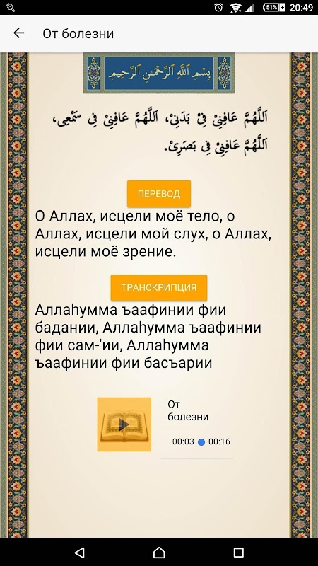 Утренние и вечерние зикры, молитвы от болезни и неверия. Возможность прочесть оригинал, перевод и транскрипцию, а также прослушать интересующие вас молитвы.