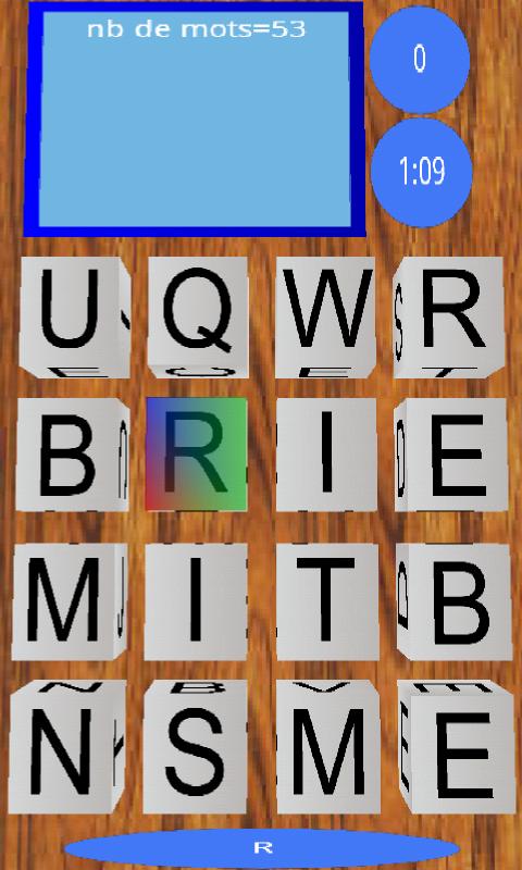 Tags: Jeu de mots, Boggle, Scrabble, Jeu pour tous, Jeu adulte, Jeu enfant, Jeu bébé, Jeu de lettres, 3D, Jeu 3D, Jeu rapide, Jeu Français, Jeu réflexion, Opengl es 1.1., ludique, éducatif.
