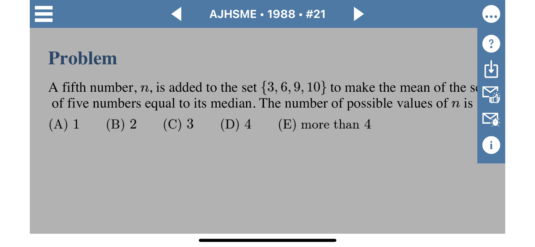 Esta aplicación contiene todos los problemas y soluciones del Examen de Matemáticas de la Escuela Secundaria Estadounidense (AJHSME) de 1985 a 1998. Además, contiene todos los problemas y soluciones de las Competencias Estadounidenses de Matemáticas (AMC 8 para estudiantes de octavo grado y menores) desde 1999 hasta hoy.