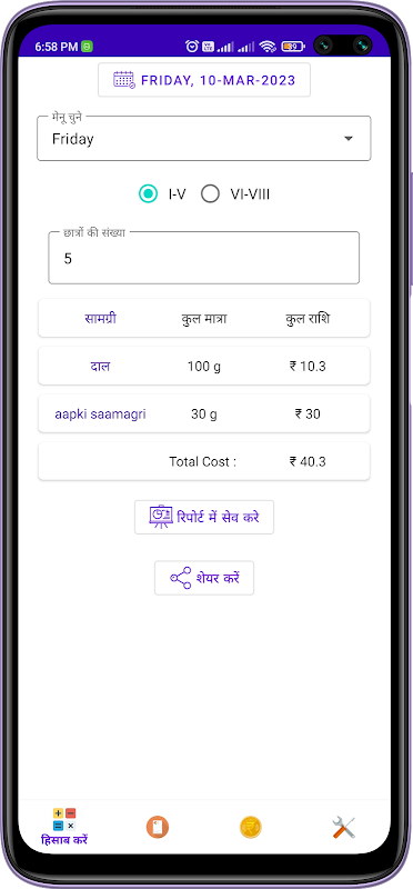 Mid Day Meal Calculator es una aplicación fácil de usar diseñada para ayudar a los profesores a calcular el costo de las comidas del mediodía para un día y generar un informe en formato pdf. La aplicación está diseñada para que el cálculo de los costos de las comidas sea simple y eficiente. Con la interfaz fácil de usar de la aplicación, los profesores pueden crear sus propios ingredientes y lista de precios según sus necesidades. La aplicación también permite a los usuarios compartir el informe con quien elijan, lo que facilita compartirlo con los administradores escolares u otras partes relevantes.