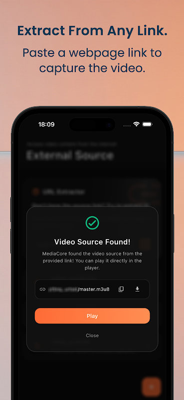 🔗 Extracción de Enlaces Web: ¿Has encontrado un vídeo en una página web pero no puedes descargarlo o reproducirlo como te gustaría? MediaCore hace la magia por ti: introduce la URL de la página y la app extraerá automáticamente el enlace fuente del streaming, permitiéndote reproducirlo directamente en el reproductor, sin distracciones.
