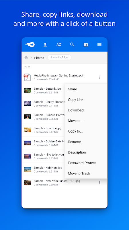 Almacene, organice y comparta todos sus archivos multimedia de forma segura a través de su teléfono Android o su tablet. MediaFire mantiene todas sus fotos, sus vídeos, su material de lectura, sus documentos de trabajo, hojas de cálculo, presentaciones, e inclusive su tarea en su bolsillo, todo listo para visualizarse o compartirse en cualquier momento. Todos sus archivos siempre estarán seguros en su cuenta de MediaFire - sin importar qué pueda sucederle a su dispositivo Android.