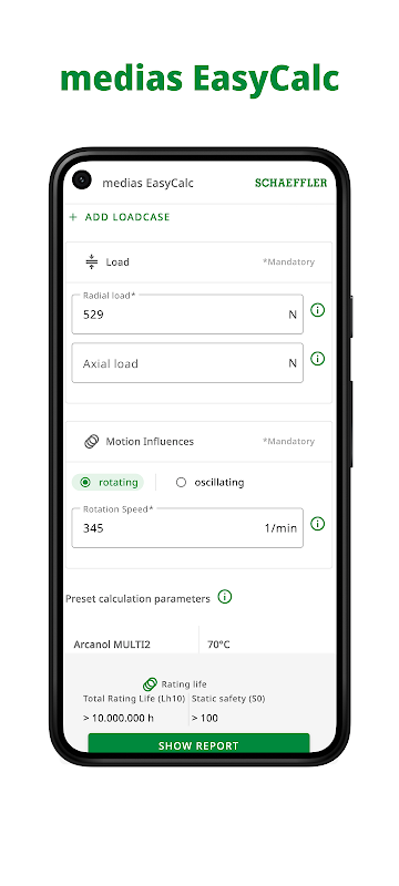 Libere el poder de la precisión con Medias EasyCalc. Diseñada para los profesionales que trabajan con rodamientos de Schaeffler, nuestra aplicación ofrece cálculos sencillos sobre la duración de vida nominal, la pérdida de potencia por fricción y las frecuencias de sobrebalanceo, gracias a la fiable suite de cálculo Bearinx. Con interfaces fáciles de usar y resultados fiables, Medias EasyCalc es su herramienta para mejorar la productividad y garantizar la precisión. Obtenga información sobre sostenibilidad gracias a las emisiones de CO2e de los rodamientos.