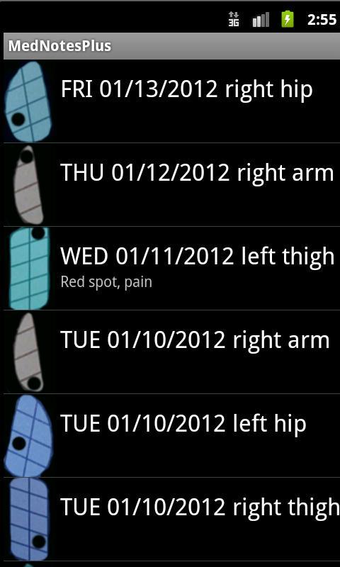 La aplicación rastrea los sitios de inyección. Podría ser utilizado por personas que toman Copaxone, Avonex, Rebif u otros medicamentos inyectables. Esta aplicación podría ser beneficiosa para las personas con esclerosis múltiple (EM) o con cualquier otra afección médica. Puede ingresar una nota rápida asociada con una inyección, agregar una nota de audio, agregar una foto o simplemente crear una nota para rastrear sus síntomas o cualquier otro evento médico.