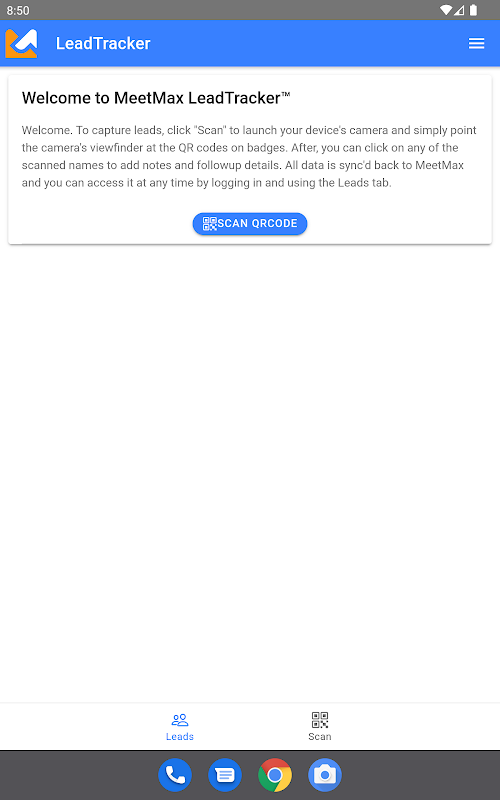 Bienvenido a la aplicación MeetMax LeadTracker, un producto de TWST Events. La aplicación le permitirá utilizar la cámara de su teléfono para escanear códigos QR generados en credenciales impresas por el servicio MeetMax Badging.