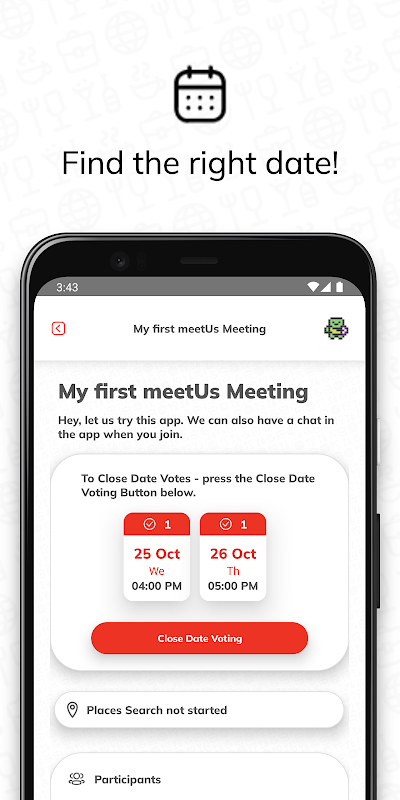 Es por eso que creamos MeetUs, que le permite chatear (comunicarse), encontrar/buscar nuevos lugares y organizar su próxima reunión con sus amigos, todo en una sola aplicación.
