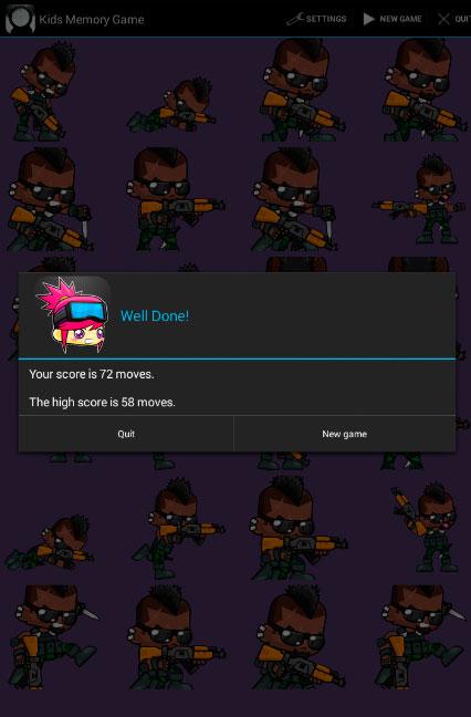 The game has 4 modes Soldier. Each mode comes with 12 pairs or 24 cards in all. Tap the card to see the item behind it. If you get one pair right, the cards will face forward. If there is a mismatch, both cards will flip backward again.