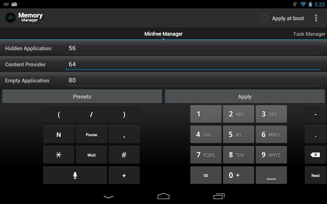 Memory Manager comes with a built in minfree tweaker and task manager. Minfree refers to the minimum free memory value, e.g. the threshold of free RAM below which idle tasks are killed. Tweaking these values can save you precious memory. There are multiple presets you can select to customize minfree to improve performance.