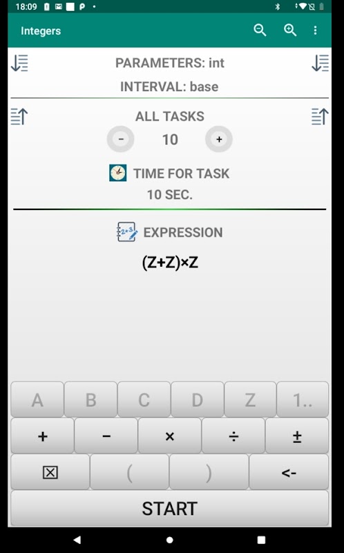 En la aplicación, puede entrenar sus habilidades de conteo utilizando su propia expresión alfanumérica. Puede crear una expresión simple para sumar dos números: A + B, o una compleja usando signos de operaciones aleatorias y paréntesis: (Z × (Z + Z ÷ Z) ± Z) ÷ Z .