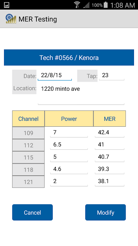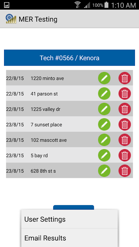 Utilice esta aplicación para registrar los resultados de las pruebas MER mientras que hasta a un grifo. Pantalla de configuración le permite configurar su Número Tech, nombre, ubicación y 5 canales de prueba, así como una dirección de correo electrónico para enviar los resultados en formato PDF.